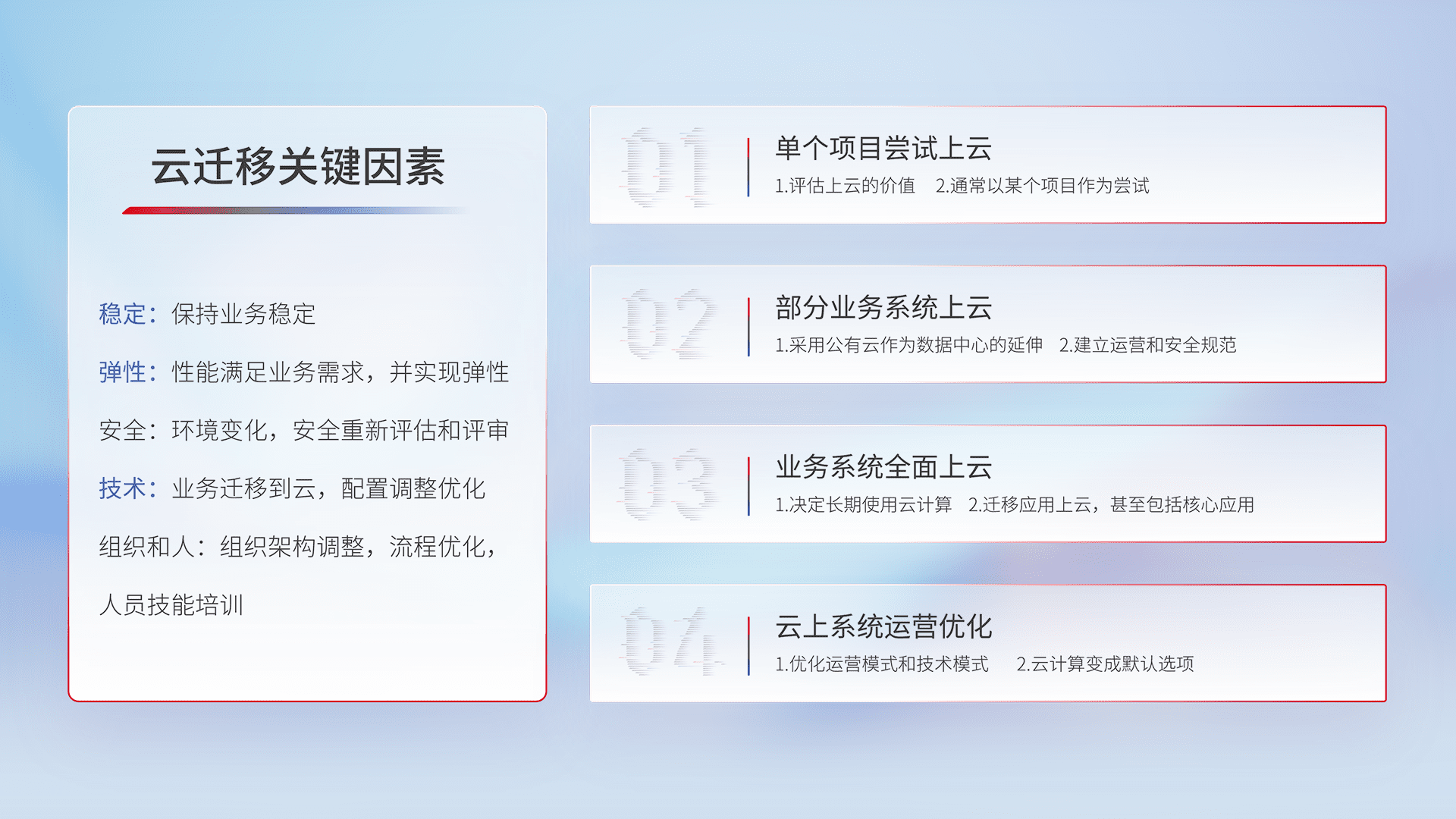 结合实际业务,,,,从规划设计、、云平台选型、、云原生改造、、、数据迁移、、、集成交付,,,,迁移全过程为客户识别最佳上云路径,,,做好风险识别管理,,,,设计网络架构、、、、身份权限、、、、安全审计合规、、、、操作审计、、日志审计、、、监控告警策略、、、多站点容灾设计等,,,,对云上基础设施进行整体规划,,,,提升IT治理水平,,,以满足弹性、、、、高可用、、高性能的需求。。。