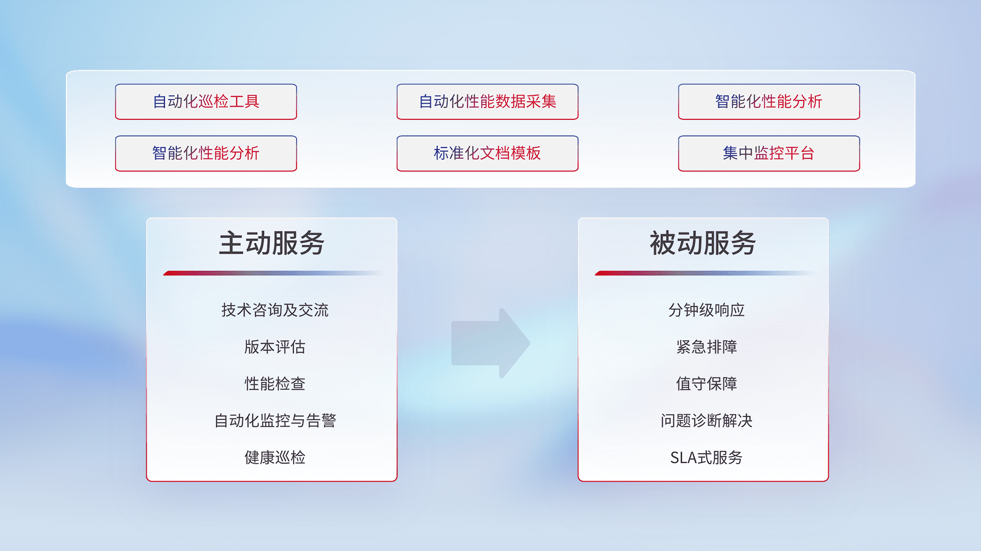 智能化工具和标准化文档,,保障服务质量,,,,提供主动服务(包含技术咨询、、、版本评估、、、性能检查、、、、自动化监控与告警、、健康巡检)和被动服务包含(分钟级响应、、、紧急排障、、、、值守保障、、、、问题诊断解决、、SLA服务)。。。。