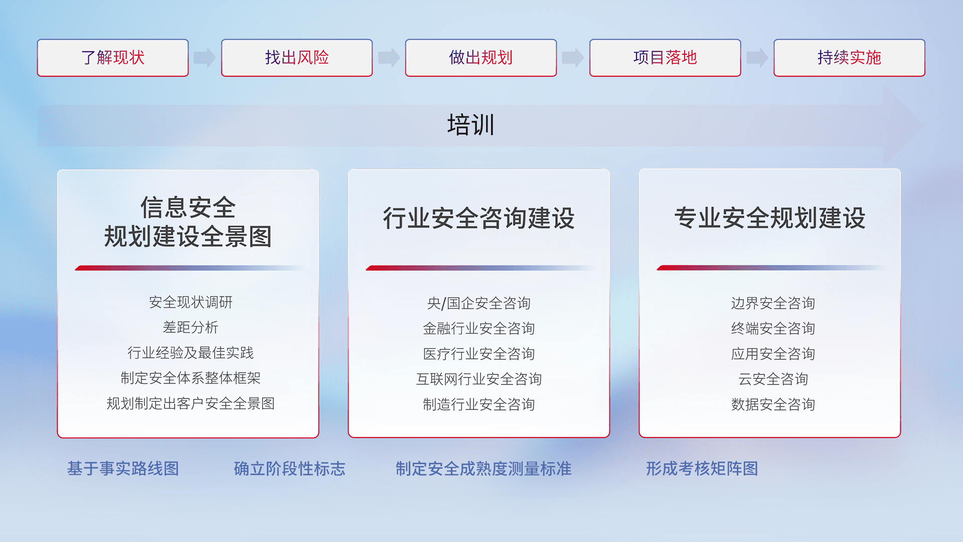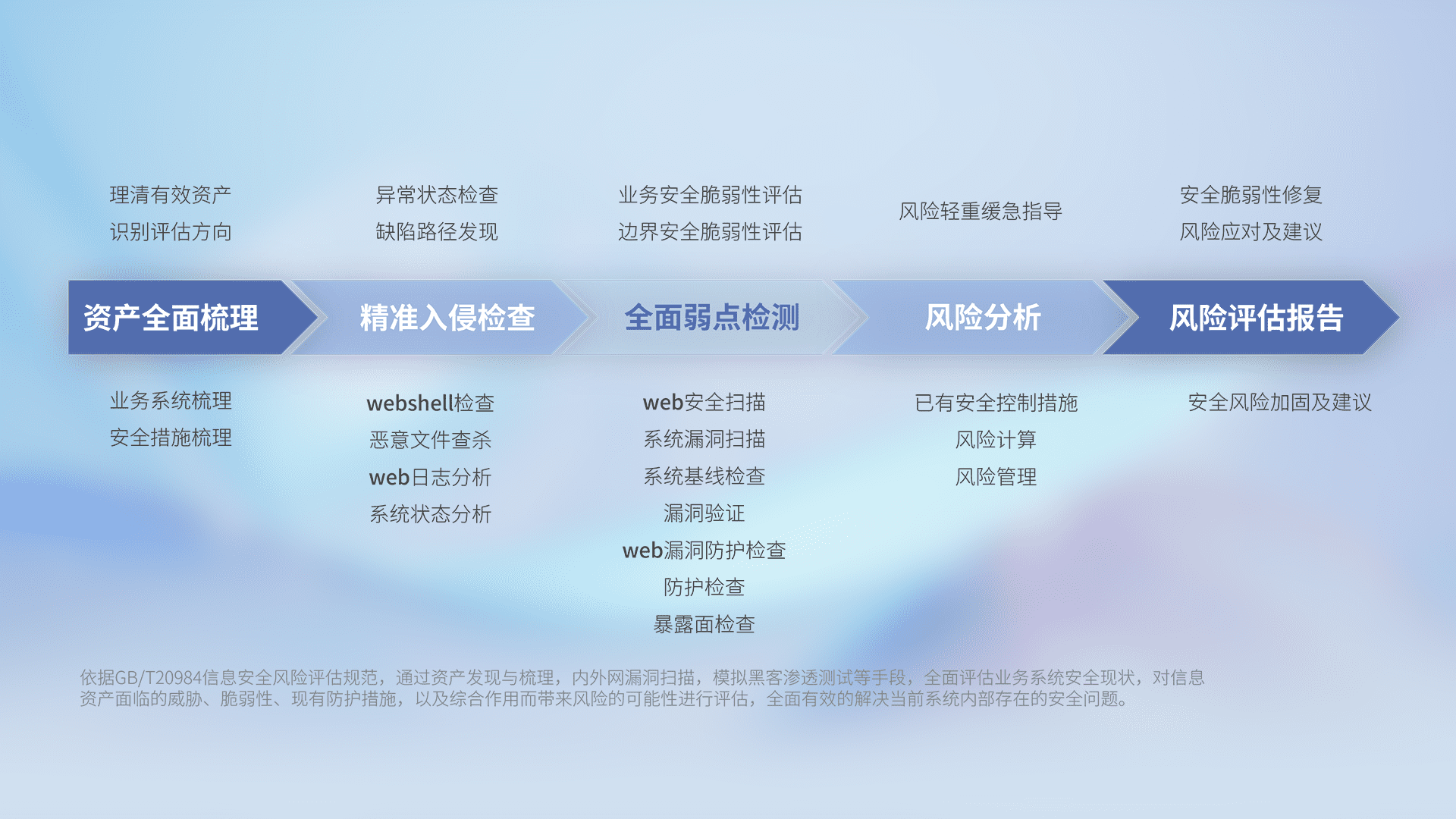 针对客户行业特性,,,以专业的安全服务+多厂商联合解决方案提供专属的一站式安全管理服务,,帮助客户全面感知网络空间威胁,,,,基于识别、、、、检测、、、分析、、、、防护、、、监测、、、响应的服务理论模型,,,从方案咨询、、、集成交付、、、、评估验证、、优化加固、、运维运营,,,致力于为客户提供完整的闭环管理式安全服务。。。。以实战经验为客户打造高抵御风险的安全体系,,,帮助客户发现威胁、、对抗威胁、、、、处置威胁,,不断积累安全对抗能力,,持续保障数字化安全。。。